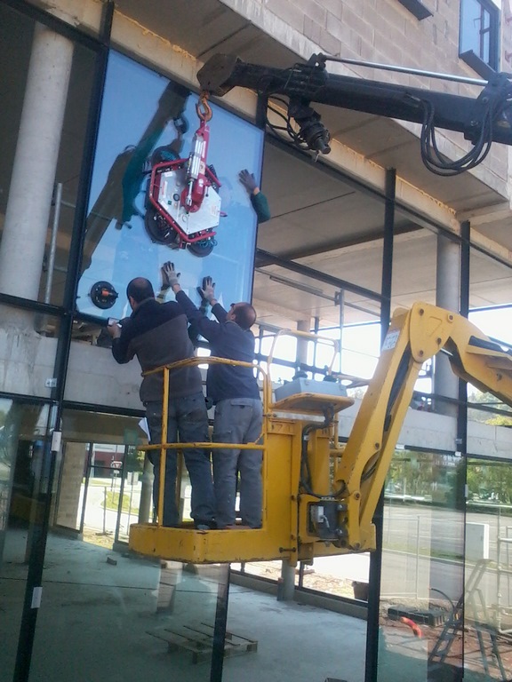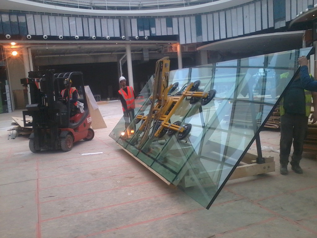 Mise en place d'un vitrage feuilleté dans une galerie de centre commercial (poids de vitrage 1100kg)